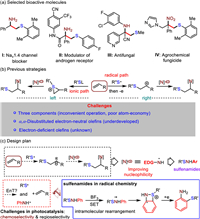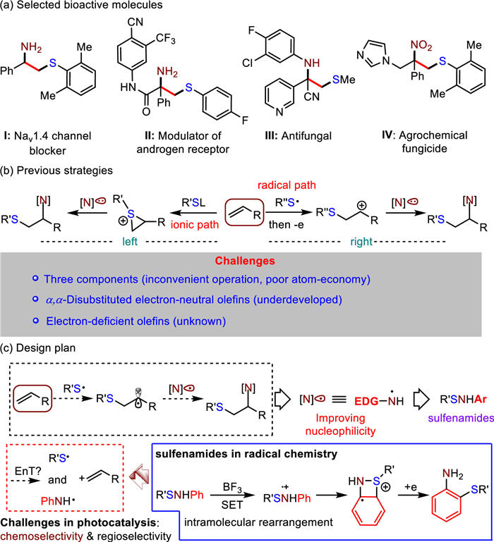 Efforts have been dedicated to the development of methodologies that enable efficient and general synthesis of valuable molecules using readily accessible substrates, while ensuring atom economy. Among these methodologies, sulfenylamination of alkenes [1–9] offers a direct and rapid route to assemble β-amino sulfides, which are prevalent in bioactive compounds (e.g., molecules I-IV, Scheme 1a) [10–13]. However, this transformation remains challenging, arising from the intrinsic reaction patterns of the two established strategies. The first one involves the utilization of thiiranium intermediates, where alkenes act as nucleophiles and subsequently undergo ring-opening with a separate nucleophile species (Scheme 1b, left) [3–6]. As an alternative, a few examples have explored the addition of thiyl radicals to alkenes, followed by single-electron oxidation and coupling with an additional nucleophile (Scheme 1b, right) [7–9]. These strategies rely on a three-component platform involving alkenes, sulfur (S), and nitrogen (N) sources. Consequently, such approaches suffer from inconvenient manipulations and poor atom economy. Furthermore, the generation of key intermediates like thiiranium or carbon cations, which are crucial for the difunctionalization process, restricts the use of electron-neutral alkenes. To the best of our knowledge, no reports have demonstrated the application of electron-deficient alkenes in sulfenylamination. Additionally, the sulfenylamination of α,α-disubstituted electron-neutral alkenes, which are valuable for constructing highly congested amines, is underdeveloped [9]. This can be attributed to the challenges posed by aza-nucleophilic coupling due to steric hindrance, as well as the propensity of in-situ-formed carbon cations for 1,2-elimination. In this context, there is a compelling need to develop a novel strategy that enables the generic sulfenylamination of alkenes in an atom-economical manner, accommodating a wide range of alkene substrates. Such a breakthrough represents a highly desirable pursuit for the scientific community.