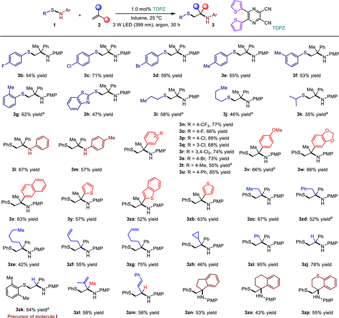 Following the establishment of optimized reaction conditions, we investigated the substrate scope of this two-component sulfenylamination protocol (Scheme 2). Initially, we tested the reaction of 2a with various benzenesulfenamides bearing S-aryls with diverse electron-withdrawing and electron-donating groups. This resulted in the formation of products 3b-3g with yields ranging from 53% to 71%. The protocol also tolerated sulfenamides with azaaryls instead of aryls as the S-substituent, as demonstrated by the formation of 3h in a 47% yield. Furthermore, the method proved to be compatible with different aliphatic sulfides, as indicated by the successful synthesis of 3i-3k. It is worth noting that the choice of the 4-methoxyphenyl (PMP) group as an N-protecting group serves two purposes: enhancing the nucleophilicity of the putative amino radical and providing an easily removable group. Nevertheless, we explored the substitution of PMP with other aryls, and products 3l-3m exhibited good compatibility with respect to substitutions on the N-aryl group. Next, we investigated various electron-neutral alkenes using 1a as the reaction partner. Notably, a wide range of α-methyl styrenes were well tolerated regardless of electronic properties or substitution patterns on the aromatic rings. This resulted in the formation of products 3n-3w in yields ranging from 55% to 89%. Furthermore, the high chemical yields observed for alkenes with fused aromatic (3x) and heteroaromatic (3y-3zb) ring substituents highlight the generality of this method. We also tested styrenes bearing distinct 2-alkyl substituents, leading to satisfactory yields of products 3zc-3zh. In the case of substrates containing two alkene moieties (3zf-3zg), sulfenylamination showed a preference for the more electron-rich one. Additionally, when 2-alkyls were replaced by 2-aryls, the reaction proceeded with higher reactivity and chemoselectivity (3zi). Simple styrene proved to be a valuable starting material for synthesizing biologically important aryl sulfides with a tertiary carbon atom adjacent to the amine group, as exemplified by the formation of products 3zj and 3zk in yields of 78% and 54%, respectively. Moreover, it is worth noting that a one-step deprotection of PMP in 3zk can provide access to a class of bioactive compounds, namely Nav 1.4 channel blockers (molecule I, Scheme 1a). In addition to styrenes, two different 1,3-dienes reacted successfully with 1a, yielding adducts 3zl-zm with satisfactory yields. Notably, the reaction with terminal alkenes (3zm) displayed higher reactivity. Finally, exocyclic C=C bonds, including 5-, 6-, or hetero-rings, were also successfully transformed into sulfenylaminated products (3zn-3zp) with yields ranging from 43% to 55%. These results highlight the broad substrate scope of the developed sulfenylamination protocol, demonstrating its versatility in synthesizing a variety of valuable products.