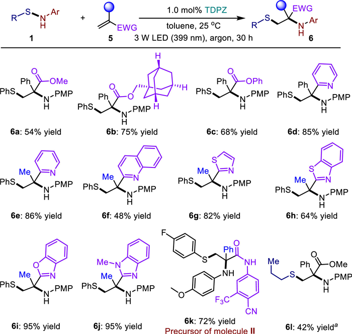 Building on the promising results, we expanded the scope of this catalysis platform to investigate the efficiency with electron-deficient alkenes, represented by substrate 5 (Scheme 3). We initially focused on 2-arylacrylates due to their potential in directly synthesizing valuable α-amino acid derivatives that possess a structurally congested amine and a β-thioether motif (e.g., molecule II, Scheme 1a). Encouragingly, products 6a-c were obtained with satisfactory yields, regardless of the alkyl and aryl substituents on the esters. Considering the prevalence of imine-containing azaarenes in pharmaceutical compounds and their electron-withdrawing nature [43], we explored the sulfenylamination of 1a with various vinylazaarenes containing α-aryls or α-alkyls, as well as diverse valuable azaarenes. Consequently, products 6d-j were obtained in yields ranging from 48% to 95%. The broad applicability of electron-withdrawing groups to olefins inspired us to further investigate a specific amide-based olefin, as its corresponding product 6k could be conveniently deprotected to yield a modulator of the androgen receptor (molecule II, Scheme 1a). Furthermore, product 6l demonstrated the potential of this strategy to assemble alkyl sulfides on these valuable tertiary amines. These findings highlight the robustness and versatility of this catalytic system in facilitating the synthesis of intricate molecules containing electron-deficient alkenes. The successful formation of structurally diverse products further emphasizes the potential of this method in accessing biologically relevant compounds and expanding the synthetic toolbox for complex molecule synthesis.