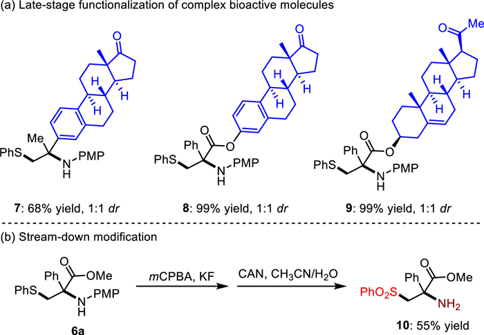 To assess the generality and potential synthetic applications of this novel methodology, the ability for late-stage functionalization of complex bioactive molecules was investigated, as depicted in Scheme 4a. The objective was to evaluate its versatility in accessing a greater variety of valuable compounds that could be useful for drug development. In this investigation, we successfully assembled estrone and pregnenolone, chosen as representative molecules, onto products 7–9 by reacting 1a with the corresponding electron-neutral and electron-deficient alkenes. This demonstrated the capability of the method to perform late-stage functionalization on complex bioactive molecules. Furthermore, to further confirm the promising synthetic applications of this method, we selected product 5a and subjected it to oxidation using 3-chloroperoxybenzoic acid (m-CPBA) to yield the corresponding sulfone. The N-PMP group in the sulfone was then smoothly cleaved using cerium ammonium nitrate (CAN), resulting in the synthesis of sulfone-based α-amino ester 10 in 55% yield over two steps (Scheme 4b). This demonstrates the efficient access to pharmaceutically important molecules I-II (Scheme 1a) using this methodology. Additionally, this strategy has the potential to address the incompatibility issues observed with N-alkyl benzenesulfenamides in the photocatalytic difunctionalization approach. These results highlight the broad synthetic applications and potential for late-stage functionalization of complex bioactive molecules using this methodology. The ability to access pharmaceutically important compounds and overcome compatibility issues further underscores the value and utility of this novel catalytic system in drug development and synthetic chemistry.