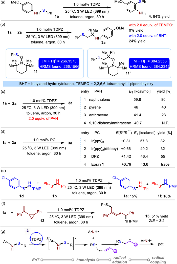 In order to gain insight into the mechanistic aspects of this strategy, extensive mechanistic studies were conducted. Initially, control experiments (Table 1, entries 16 and 17) indicated that TDPZ serves as the photosensitizer in the photocatalytic sulfenylamination. However, considering the photochemical and photophysical properties of TDPZ, the photoactivated TDPZ (*TDPZ) could potentially initiate the reactions through either single-electron transfer (SET) or energy transfer (EnT) with benzenesulfenamides. This hypothesis is further supported by comparing the redox potentials and triplet energies of the species involved, as well as the results of the Stern-Volmer experiment. To elucidate the actual excitation mode, a series of elaborate studies were conducted. Firstly, when 1a was subjected to the established reaction conditions without the presence of alkenes, product 4 was obtained in an 84% yield. This result suggests the occurrence of a competing chemical transformation involving SET of benzenesulfenamides to *TDPZ (Scheme 5a). These findings provide important insights into the mechanistic aspects of this strategy. They indicate that the photoactivated TDPZ can engage in either SET or EnT processes with benzenesulfenamides, thereby initiating the desired transformations. Further investigation and characterization of the reaction intermediates and excited states are necessary to obtain a comprehensive understanding of the underlying mechanisms.