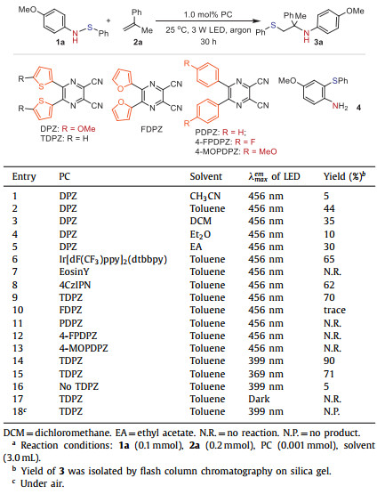 Motivated by the potential of sulfenamides and the prospects of energy transfer (EnT) synthesis, we set out to test the aforementioned hypothesis. To explore the construction of challenging amines adjacent to congested carbons, we selected N-(4-methoxyphenyl)-S-phenylthiohydroxylamine (1a) and α,α-disubstituted prop–1-en-2-ylbenzene (2a) as our model substrates (Table 1). To begin, we evaluated the electrochemical properties of 1a, finding that it had an Ep value of +0.76 and +1.61 vs. SCE in CH3CN, along with an ET = 37.2 kcal/mol (See Supporting information for details). Additionally, we determined the bond dissociation energy (BDE) of the N-S bond in 1a to be 32.8 kcal/mol (see Supporting information). These results suggested the feasibility of N-S bond homolysis under excitation by energy transfer. Subsequently, we tested our self-developed photosensitizer, DPZ (Et(S*/S•‒) = +1.42 V vs. SCE in CH3CN, ET = 46.4 kcal/mol) [38–40], which has demonstrated widespread utility in visible light-driven photocatalytic reactions [41,42]. Upon irradiation with a 3 W blue LED (