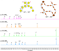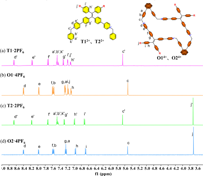 In the synthesis (Scheme 1), we employed template-free and highly diluted reaction conditions. Firstly, 1.0 equiv. of 1,2-bis(4-bromomethylphenyl)-o-carborane (1a) was reacted with 2.0 equiv. of TPE derivative 2a or 2b containing pyridine groups for one day without isolating the intermediate product. Then, an additional equivalent of dibromide 1a was added, and the reaction was continued for five days to obtain the crude product with Br− counterion. Subsequently, the Br− counterion was transformed into PF6− for facilitating the purification and separation of macrocycles, resulting in separation yields of 25% for O1·4PF6 and 37% for O2·4PF6, respectively. Most cyclization experiments typically require a two-step synthesis [41,43,44] or need the introduction of a template for cyclization [45,46]. For some reported one-pot ring closure reactions without the template, the resulting yields were generally below 20% [15,23]. In contrast, our approach does not require a two-step synthesis or using a template, and the yields are higher. The macrocycles O1·4PF6 and O2·4PF6 were successfully characterized using 1H NMR, 13C NMR, HR-MS and single-crystal X-ray diffraction. In the 1H NMR spectra (Fig. 1) of O1·4PF6 and O2·4PF6, it can be found that the chemical shifts of the two macrocycles are similar except for the benzene ring of the TPE units outside the ring, indicating that they have similar cyclic structures. Additionally, compared with the corresponding non-macrocyclic compounds T1·2PF6 and T2·2PF6, the proton chemical shifts of the pyridine and the TPE moieties in the ring (d, e, f, g) are higher than those of the non-cyclized compounds (d′, e′, f′, g′), which could be attributed to the shielding effect after cyclization, since the chemical shifts of the exocyclic benzene ring of TPE unit (i, h) and (i′, h′) are similar. Moreover, for the benzene ring connected to the methylene, the chemical shift of the hydrogen atom (a) linked to the o-carborane is higher than that of hydrogen atom (b) adjacent to the pyridine unit, since the pyridinium cation is a stronger electron-withdrawing group than o-carborane.