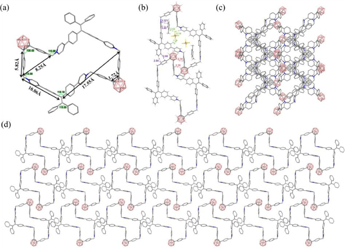 Carborane is a three-dimensional cage-like structure with a icosahedron shape. It has advantages such as three-dimensional aromaticity, good redox properties, thermal stability, rigid structure and high boron content [29]. Due to the unique structure and properties of carborane, macrocycles based on carborane skeleton have been well studied since the 1990s [30–34]. For example, Jin and coworkers have utilized carborane as the framework structure to develop a series of metal-coordinated macrocycles and cages, which can achieve the separation of light hydrocarbons through interactions such as dihydrogen bonding [35–38]. Carborane embedded necklace-shaped nanohoops with high a solution quantum yield were synthesized by Li and coworkers [39]. Very recently, our group reported carborane-based triangular aromatic alkyne macrocycles, which also demonstrated the AIE effect and can identify nitroaromatic compounds [40].
