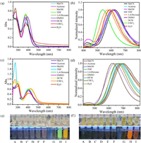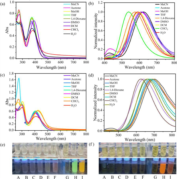 | Fig. 3. (a) UV–vis absorption spectrum and (b) fluorescence emission spectrum of O1·4PF6 (1.0 × 10−5 mol/L) under different solvent conditions, λex = 365 nm. (c) UV–vis absorption spectrum and (d) fluorescence emission spectrum of O2·4PF6 (1.0 × 10−5 mol/L) under different solvent conditions, λex = 400 nm. UV light illuminated fluorescence images of (e) O1·4PF6 and (f) O2·4PF6 in different solvents. A-I are acetonitrile, acetone, methanol, tetrahydrofuran, dioxane, dimethyl sulfoxide, dichloromethane, chloroform, water. | |