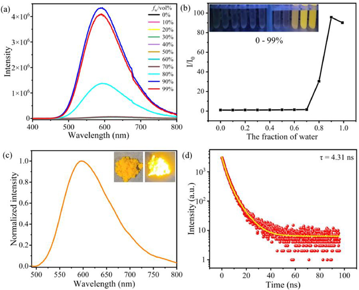 | Fig. 4. (a) Fluorescence spectra and (b) plot of maximum emission intensity of O1·4PF6 (1.0 × 10−5 mol/L) versus H2O fraction in MeCN–H2O mixture. (c) The solid-state fluorescence spectrum and (d) solid-state fluorescence lifetime of O1·4PF6. (Inset) Fluorescence images of O1·4PF6 versus H2O fraction (0–99%) in MeCN–H2O mixture under UV light (365 nm). λex = 365 nm, Ex/Em slit = 3 nm. | |