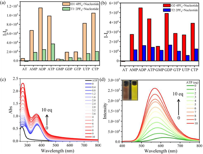 | Fig. 5. (a) The I-I0 of O1·4PF6 with 4.0 equiv. nucleotides. (b) The I-I0 of O2·4PF6 with 4.0 equiv. nucleotides. (c) UV–vis titration spectra of O1·4PF6 (1.0 × 10−5 mol/L) in MeCN with ATP (0–10.0 equiv.). (d) Fluorescence emission spectra of O1·4PF6 (1.0 × 10−5 mol/L) in MeCN with the ATP (0–10.0 equiv.). (Inset) Fluorescence images of O1·4PF6 (1.0 × 10−5 mol/L) in MeCN (left) and with 10.0 equiv. ATP (right) under UV light (365 nm). | |