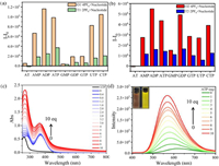 Bio-molecule nucleotides contain phosphate groups, pentose sugars, and nitrogenous bases, forming various types of nucleotides with life information according to different connection methods. Nonetheless, these molecules lack fluorescent groups and are difficult to be detected and identified. Fluorescence detection, characterized by its exceptional sensitivity, is a widely employed analytical technique [49–51]. Our cyclized compounds have cationic groups, cyclic hydrophobic cavities, and fluorescent groups, and we anticipated that these TPE cationic cyclophanes can recognize and detect nucleotides through electrostatic interactions, hydrophobic interactions and other interactions. Nine nucleotides (Scheme S2 in Supporting information) were selected for detection, including AT with no phosphate, AMP and GMP with one phosphate, ADP and GDP with two phosphate groups, and ATP, UTP, CTP and GTP with three phosphate groups. We conducted fluorescence titration experiments by gradually adding aqueous solutions of various nucleotides to acetonitrile solutions of O1·4PF6 and O2·4PF6 (Figs. S41–S49, S75–S83 in Supporting information). We selected to present a column chart of fluorescence enhancement by adding 4.0 equiv. of different nucleotides (Fig. 5). O1·4PF6 and O2·4PF6 show minimal fluorescence response to AT. O1·4PF6 demonstrates significant enhancement towards AMP, ATP, ADP, UTP, CTP and the fluorescence saturation was achieved around 40.0 equiv. of nucleotides. Conversely, it shows weaker enhancement towards GMP, GDP and GTP, which have guanine as the base. This indicates that besides the role of phosphate groups, the variation in bases also plays a significant influence on fluorescence changes. As for O2·4PF6, it shows the strongest recognition towards ADP, followed by GDP, which is different from the behavior of O1·4PF6. This interesting phenomenon can be primarily attributed to photo-induced electron transfer (PET), with O1·4PF6 having a stronger electron transfer with guanine compared to O2·4PF6 [28]. In addition, we conducted UV–vis titration (Fig. 5c, Figs. S32–S40 and S66–S74 in Supporting information) and fluorescence titration (Fig. 5d, Figs. S41–S49 and S75–S83 in Supporting information) experiments by gradually adding 0–10.0 equiv. of nucleotides. We found that, except for AT, both the UV–vis absorption enhancement ability and fluorescence enhancement ability showed a linear relationship with the equivalent amount of added nucleotides. We calculated their detection limits using LOD = 3σ/k (Tables S2 and S5 in Supporting information), and they all exhibited low detection limits except for AT. Furthermore, we compared the recognition abilities (Figs. 5a and b) of O1·4PF6 and O2·4PF6 with the non-cyclized model compounds T1·2PF6 and T2·2PF6. The results showed that the cyclic compounds exhibited stronger recognition abilities toward nucleotides compared to the model compounds. This is primarily due to the cyclic compounds having more positively charged structures, resulting in enhanced recognition abilities.