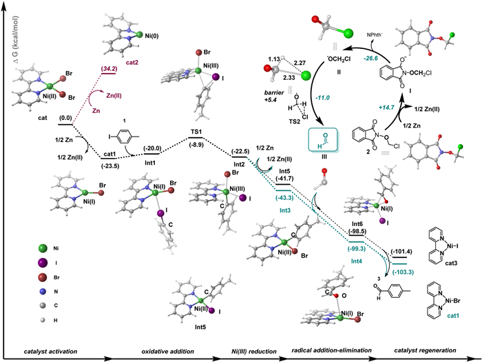 To further elucidate the reaction mechanism, detailed DFT calculations have been carried out. In the presence of Zn powder, the original catalyst L-Ni(II)Br2 can be reduced to the form of low valent Ni. As shown in Fig. 1, the Gibbs free energy change in the process of reducing to Ni(0) catalyst cat2 is 34.2 kcal/mol, which is difficult to carry out under the current reaction conditions at room temperature. Relatively, the energy change for the process of reducing to Ni(I) catalyst cat1 (LNi(I)Br) is −23.5 kcal/mol, which is the favorable process. Therefore, Ni(I) is the form of active catalyst. The I atom in p-iodotoluene 1 then complexes with cat1 to obtain Int1, and the intermediate undergoes oxidative addition transition state TS1 to obtain the Ni(III) intermediate Int2, with an energy barrier of 14.6 kcal/mol (cat1→TS1). The obtained intermediate Int2 was then reduced by Zn powder to form a Ni(II) intermediate, which prepared for the subsequent formyl radical addition. In this process, both halogen atoms (Br and I) of Int2 can be reduced. The Ni(II) intermediates Int3 and Int5 were obtained by removing Br or I, respectively, with energies of −43.3 and −41.7 kcal/mol, respectively. In the subsequent formyl radical addition step, we hope to obtain the Ni(III) intermediate for Ni−C bonding, but during the structure optimization process, the formyl group and toluene group are automatically bonded to form Ni(I) intermediates Int4 and Int6, respectively, with corresponding energies of −99.3 and −98.5 kcal/mol, respectively. This shows that the C—C bonding step is extremely advantageous in terms of kinetics and thermodynamics. Finally, product 3 was generated, and the recyclable Ni(I) active catalysts cat1 and cat3 were obtained, with free energies of −103.3 and −101.4 kcal/mol, respectively. Accordingly, the Ni−Br involved mechanism (black lines) is more favorable than that of Ni−I (dark green lines), L-Ni(I)Br is therefore the advantageous form of active catalyst.