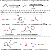 | Scheme 1. Nickel-catalyzed reductive cross coupling via radical intermediates for the formation of C–C bonds. | |