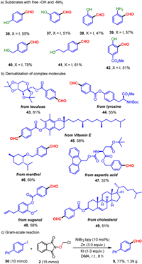Of particular note, substrates containing unprotected phenolic hydroxyl, primary amino and alcoholic hydroxyl, which were difficult substituents in transition metal-catalyzed cross-couplings, were compatible well in this reductive formylation, further demonstrating the high compatibility of this transformation with diverse functional groups (Scheme 3a). The robustness and synthetic significance of the catalytic protocol were also shown on the late-stage functionalization of derivatized biologically relevant scaffolds (Scheme 3b). As an illustration, derivatives of levulose and amino acids (tyrosine, aspartic acid) reacted smoothly to deliver the corresponding products in moderate yields (43, 44, 47). Additionally, highly lipophilic scaffold such as Vitamin E derivative proved to be suitable as well, providing the desired aldehyde in 58% yield (45). Derivatives of cholesterol, eugenol and the natural product menthol were also well compatible with this reaction (46, 48, 49), with the olefin groups tolerated. Finally, to evaluate the practicality of this approach, a gram-scale experiment was carried out. To our delight, the desired product was successfully constructed in 77% yield (Scheme 3c).