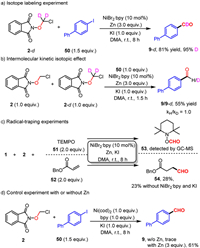 To gain more insight into this reaction, a series of mechanistic studies were conducted (Scheme 4). The isotope-labeling experiments provided product with up to 95% deuterium incorporation (Scheme 5a), indicating that the aldehyde hydrogen of the product comes from ClCH2O unit. Moreover, intermolecular isotope competition experiments show that the elimination of HCl is not the rate-determining step in this transformation (Scheme 5b) [93,94]. The capture of formyl radical with the use of radical scavengers (TEMPO, 51) and Michael acceptor (benzyl acrylate, 52) under the standard conditions confirmed the radical process in this reaction (Scheme 5c) [95–97]. Furthermore, the radical adduct 53 could still be detected and addition product 54 could be obtained in 23% yield in the absence of nickel catalyst and KI, implying that zinc powder plays an essential role in the reduction of α–chloro N-methoxyphthalimide to generate formyl radical, while nickel catalyst is useless in this process. Additionally, the control experiments with stoichiometric of Ni(0) with or without of zinc afforded the desired product in trace and 61% yield respectively, further suggesting that Ni(0) alone failed to promote the formation of formyl radical (Scheme 5d) [74,98].