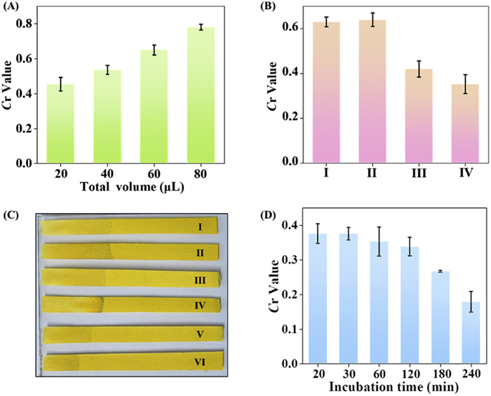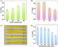 | Fig. 3. Optimization of the experimental conditions of the D-LAF sensor. (A) The Cr values corresponding to different detection volumes. (B) The Cr values of the TAL solutions without (I) or with endotoxin (III) after incubation for 60 min at 37 ℃, and those of the solutions incubated for additional 3 min at 4 ℃ (II, IV). (C) The photograph and (D) Cr values of sensor after co-incubation of the TAL reagents and endotoxin (5 EU/mL) for different time (from I to VI: 20 min, 30 min, 60 min, 120 min, 180 min, 240 min). | |