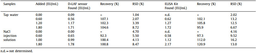 Table 1 Endotoxin detection in tap water and NaCl injection solution by the D-LAF sensor and the ELISA kit. |