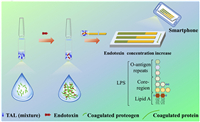 Recently, many efforts have been devoted to develop alternative approaches for endotoxin detection such as colorimetric, electrochemical, and fluorescent assay [3,4]. Among them, the endotoxin quantification mostly relies on the affinity between endotoxin and the natural or artificial recognition molecules such as peptides [5], antibodies [6], aptamers [7], plasmonic nano-particles [8], and synthetic small molecules [9]. However, these methods are generally restricted in practice because of the high cost and complex operation. The golden standard for clinical detection of endotoxin, designated as the legal method by European and American Pharmacopoeia, is the tachypleus amebocyte lysate (TAL) assay. It inevitably requires the use of TAL reagents extracted from the unique blue blood of horseshoe crabs. The blood of horseshoe crabs contains a nucleated type of deformable cells, which have a large number of dense granules in the cytoplasm, containing coaguloge, C-factor, B-factor, and coagulated proteogen. In the presence of endotoxin, C-factor in TAL reagents can be activated to continually trigger the transformation of coagulated proteogen to coagulated protein, which results in the formation of a gel state. The coagulation process is shown in Fig. S1 (Supporting information). The TAL assay usually involves gel and spectroscopy methods dependent on the enzyme cascade agglutination reaction between endotoxin and TAL in the presence of proteinogen and activator C [10]. The gel method is a semi-quantitative test with the disadvantages of low sensitivity and difficulty to identify false positives. The spectrophotometry method is achieved by monitoring the turbidity variation induced by the gelation of TAL or absorbance change caused by the released p-nitroaniline from specific chromogenic substrate [11–13]. The spectrophotometry method exhibits the virtues of quantitative detection, and nevertheless often suffers from the requirement of specialized photometric instruments and high-price reagents [14]. In addition, all of the above methods are usually in demand for a large amount of TAL reagents (≥100 µL) for each test. Due to the factors such as marine environmental pollution and human overfishing, the number of horseshoe crabs has been declining sharply, so it is classified as protected animals, leading to the shortage of horseshoe crab blood supply. Therefore, it is highly demanded to develop alternative methods for rapid endotoxin detection using trace amounts of TAL reagents.