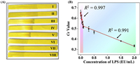 | Fig. 4. The sensitivity of the D-LAF sensor. (A) The photograph of the sensor and (B) the function between the Cr value and the concentration of endotoxin (I, II, III, IV, V, VI, VII, VIII represent the responses of the sensor to endotoxin at 0, 0.01, 0.1, 0.3, 0.5, 1.5, 2.0, 5.0 EU/mL, respectively). | |