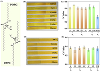 | Fig. 5. The selectivity of the D-LAF sensor. (A) The chemical structures of POPG and DPPC. The photograph and corresponding Cr values (B, C) of the sensor in the presence of S1 (H2PO4−, NaCl), S2 (cysteine, proline, glucose), S3 (DPPC, POPG), and S4 (endotoxin), respectively. The photograph and corresponding Cr values (D, E) of the sensor in the co-existence conditions of endotoxin with S1 (NaCl), S2 (cysteine, proline, glucose), S3 (DPPC, POPG), and S4 (endotoxin only), respectively. | |