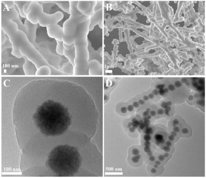 | Fig. 2. SEM (A, B) TEM (C, D) images of 7.3%Fe3O4@PDVB. | |
