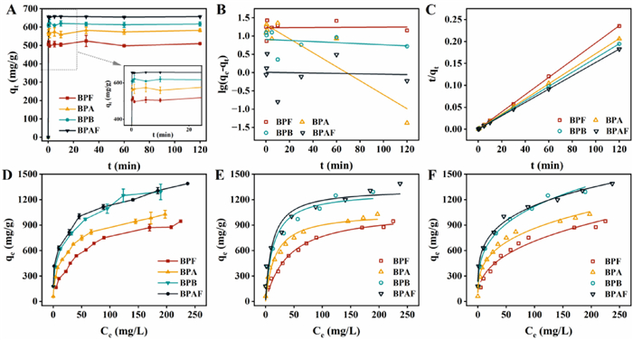 | Fig. 3. Adsorption kinetics (A), pseudo-first-order (B), pseudo-second-order (C), adsorption isotherm (D), Langmuir model (E) and the Freundlich model (F) of BPs on the 7.3%Fe3O4@PDVB material. | |