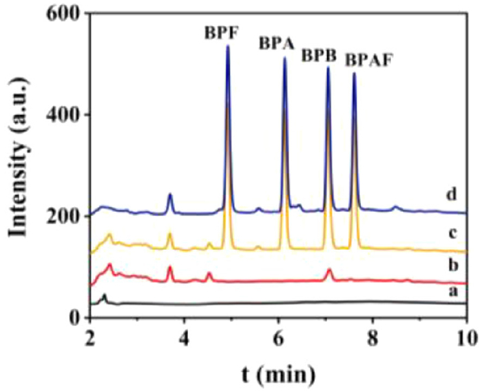 As a significant monomer to prepare polycarbonates and epoxy resins, bisphenol A (BPA) are widely utilized in the manufacture of baby bottles, beverage packaging, dental sealants, and other products. Due to estrogen-like effects, BPA can cause biological reproductive abnormalities and disrupt normal endocrine functions in humans even at very low concentrations [1,2]. The overuse of BPA will cause various environmental pollution [3,4]. In recent years, bisphenol B (BPB), bisphenol F (BPF) and bisphenol AF (BPAF) were used as substitutes for BPA. However, more and more evidences demonstrate that they have equally harmful to species and ecosystems [5,6]. Therefore, it is very necessary to develop sensitive method for detection of trace bisphenols (BPs).
