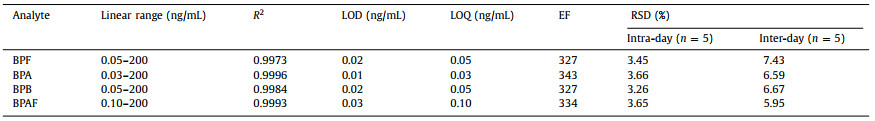 The linear range, limit of detection (LOD), limit of quantification (LOQ), coefficient of determination (R2), enhancement factor (EF) and relative standard deviation (RSD) were achieved to analyze the performance of method (Table 1). The method presented excellent linearity for target BPs ranging 0.03–200 ng/mL with R2 not less than 0.9973. The LODs with S/N at 3 were achieved between 0.01–0.03 ng/mL. LOQs (S/N = 10) of method were 0.03–0.10 ng/mL. The enrichment factor (EF) defined as the slope of the linear curve of the standard solution after enrichment by the MSPE method divided by slope of linear curve of the unenriched standard solution. The EF values of 7.3%Fe3O4@PDVB for BPs ranged from 327 to 343, which were significantly higher than those of the other materials (Table S2 in Supporting information). The RSDs of intra-day and inter-day were determined as 3.26%−3.66% and 5.95%−7.43%, respectively, which shows that the established method has good reproducibility. Besides, reusability is the key indicator to evaluate sorbent, because it relates to whether the sorbent can be used in practical production. The sorbent can be quickly eluted by methanol solution for re-adsorption and displayed high reusability. Experimental results showed that the extraction efficiency has not significant reduction within six times (Fig. S5 in Supporting information).
