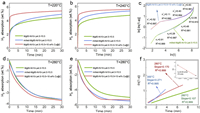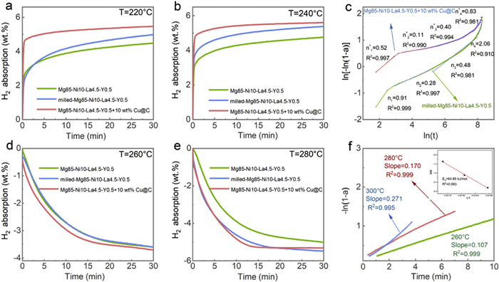 | Fig. 2. Isothermal absorption kinetic curves of Mg85-Ni10-La4.5-Y0.5, milled-Mg85-Ni10-La4.5-Y0.5 and Mg85-Ni10-La4.5-Y0.5-10 wt% Cu@C at various temperature: (a) 220 ℃; (b) 240 ℃. (c) JMAK fitting curves of isothermal hydrogenation of Mg85-Ni10-La4.5-Y0.5-10 wt% Cu@C and milled-Mg85-Ni10-La4.5-Y0.5 at 220 ℃. Isothermal desorption kinetic curves at various temperatures: (d) 260 ℃; (e) 280 ℃. (f) Fitting curves of the isothermal dehydrogenation curves by using JMAK. | |