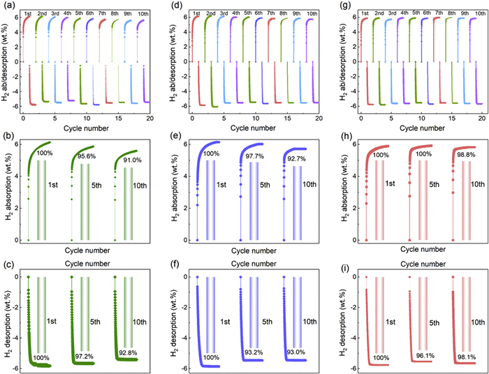 | Fig. 3. Cycle performance of (a-c) Mg85-Ni10-La4.5-Y0.5 at 300 ℃, (d-f) milled-Mg85-Ni10-La4.5-Y0.5, (g-i) Mg85-Ni10-La4.5-Y0.5+10 wt% Cu@C. | |