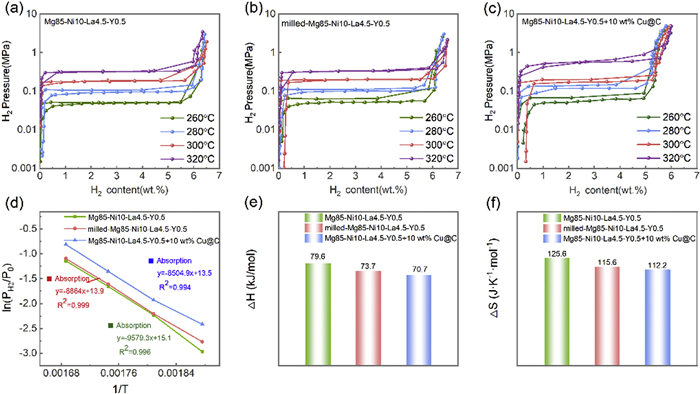| Fig. 4. PCT curves of (a) Mg85-Ni10-La4.5-Y0.5, (b) milled-Mg85-Ni10-La4.5-Y0.5, (c) Mg85-Ni10-La4.5-Y0.5-10 wt% Cu@C. (d) Van't Hoff plots for the hydrogen absorption and desorption process. (e) Enthalpy change of the hydrogen absorption reaction. (f) Entropy change of the hydrogen absorption reaction. | |