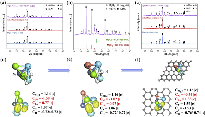 | Fig. 5. (a) XRD patterns of Mg85-Ni10-La4.5-Y0.5, milled-Mg85-Ni10-La4.5-Y0.5, and Mg85-Ni10-La4.5-Y0.5-10 wt% Cu@C. (b) XRD patterns of hydrogenated Mg85-Ni10-La4.5-Y0.5-10 wt% Cu@C. (c) XRD patterns of dehydrogenated alloys. (d) The optimized structures of Mg-Ni-La-Y and charge density difference. (e) The optimized structures of Mg-Ni-La-Y with Cu and charge density difference. (f) The optimized structures of Mg-Ni-La-Y with Cu@C and charge density difference. | |