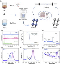 | Fig. 1. The characterizations of Cu@C composite. (a) Synthesis schematic. (b) XRD patterns of Cu@C and Cu-BTC composites. (c) TGA curve. (d) XPS spectra. High-resolution XPS spectra of (e) O 1s, (f) C 1s, (g) Cu 2p. | |