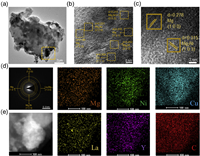 | Fig. 6. (a) TEM of Mg85-Ni10-La4.5-Y0.5-10 wt% Cu@C. (b, c) The detailed HRTEM image. (d) SAED pattern of Mg85-Ni10-La4.5-Y0.5-10 wt% Cu@C. (e) STEM-BF image and corresponding EDX mappings of Mg, Ni, La, Y, Cu, and C. | |