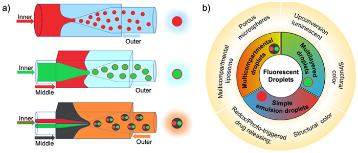 Over the past few decades, microfluidic technology has undergone significant progress and found widespread applications across diverse fields, including biomedicine, chemical analysis, and materials science [1-6]. Microfluidic droplets, often ranging in size from picoliters to nanoliters, represent tiny liquid compartments or discrete volumes manipulated within microfluidic systems. These droplets serve various purposes, including conducting chemical reactions, analyzing biological samples, transporting materials, and facilitating chemical and biological separations. Microfluidic droplets offer numerous advantages, such as high controllability, efficiency, precise sample handling, and automation capabilities, making them highly appealing to researchers and practitioners alike [7-12]. The preparation methods for microfluidic droplets are diverse, with their properties and applications heavily influenced by the chosen method [13]. The methods can be broadly categorized based on droplet structure into simple emulsion droplets, multilayered droplets, and multicompartmental droplets [14-16].
