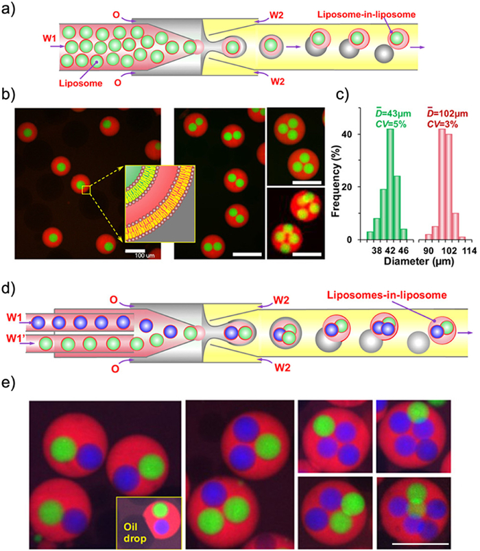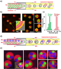 | Fig. 10. (a) Schematic diagram of microfluidic chip for the fabrication of multicompartmental liposome droplets, and the phase separation of oil and vesicles induced by solvent evaporation. (b) CLSM images of liposome droplets with varied internal core numbers. (c) Particle size distributions of droplets and internal core vesicles. (d) Schematic diagram of microfluidic chip in generating liposome droplets with multiple distinct cores. (e) CLSM images of liposome droplets with varied distinct core. Reproduced with permission [19]. Copyright 2017, American Chemical Society. | |