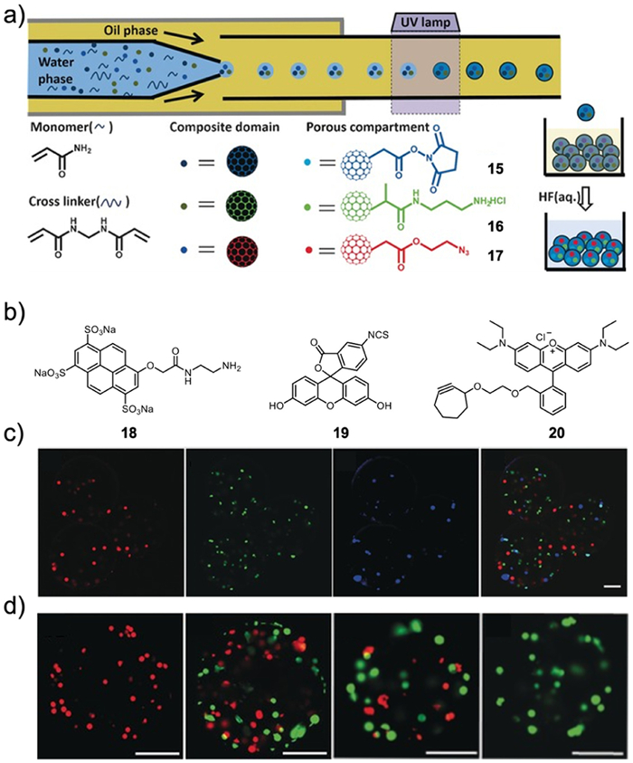 It is worth noting that multicompartmental droplets offer the ability to create multiple independent, non-miscible compartments, similar to subcellular organelles within a cell. Each compartment can serve a unique function without interfering with others. However, the challenge in developing multi-core liquid droplets/capsules arises in subsequently modifying different compartments and introducing various functionalities. This can be achieved by adding different molecules to different compartments, allowing them to interact and form complex networks. Li and coworkers developed a capillary microfluidic chip for producing porous systems with multiple stable, independent compartments featuring a reactive multidomain configuration [83]. These multicompartmental droplets consist of silica microspheres coated with three orthogonally ligands (15, 16 and 17), along with a monomer acrylamide capable of crosslinking and polymerization. In the droplet formation channel, ultraviolet radiation induced polymerization within the droplets, resulting in stable, mesh-like hydrogel microspheres. Subsequently, hydrogen fluoride (HF) solution was introduced to remove the silica microsphere template, exposing the interior compartments and the orthogonal sites available for modification (Fig. 11a).