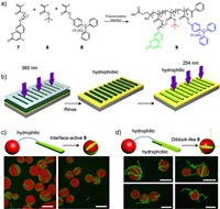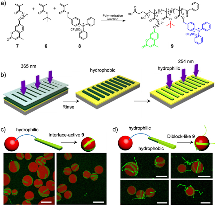 | Fig. 4. (a) Synthetic route of co-polymer 9 through a free radical polymerization of compounds 6, 7 and 8. (b) Schematic representation of the formation of ribbon-like polymer and surface modification process via photopolymerization and deprotection steps. Schematic representation and CLSM images of droplets incubated with (c) hydrophilic 9 or (d) diblock-like 9 (hydrophilic and hydrophobic), the scale bar (10 µm) is suitable for all images. Reproduced with permission [54]. Copyright 2022, American Chemical Society. | |