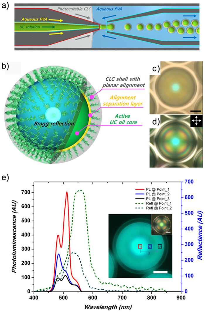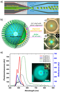 Using this principle, Reichmanis and coworkers employed the same capillary microfluidic chip to fabricate multilayered droplets containing CLC (Fig. 7a) [69]. The core oil phase comprised a hydrocarbon solution and a pair of upconversion (UC) sensitizers based on TTA emitter chromophores. A relatively low-viscosity medium, 1-bromohexane, was selected for its support of the external heavy-atom effect, which facilitates inter-system crossing. By adjusting the concentration of chiral dopants, the chiral pitch of the CLC could be modified. The core exhibited a pale yellow-green color due to the absorption of red and blue upconversion spectra (Fig. 7b). Owing to its narrow stopband, the microcapsules remained transparent across nearly all visible light wavelengths. Cross-polarized microscopy revealed a Maltese cross pattern in the refraction of liquid crystals (Figs. 7c and d). The spherical symmetry of the capsules led to local variations in the degree of resonant enhancement at normal incidence, amplifying the delayed fluorescence emission at the stopband edge (Fig. 7e).