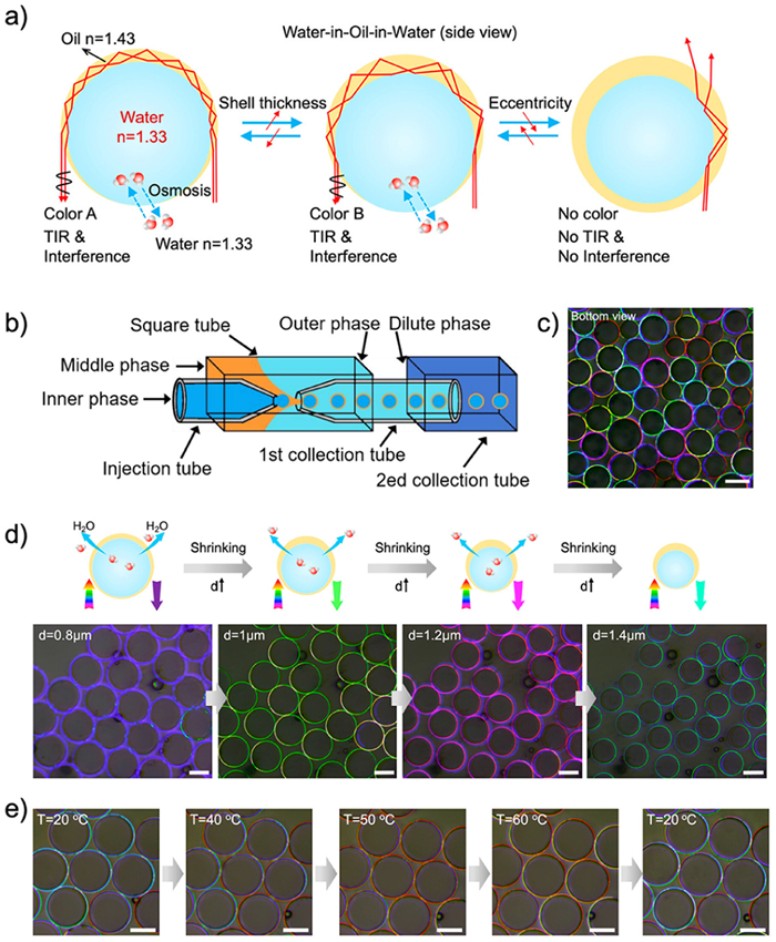 Coaxial capillaries are used in this microfluidic chip, which consist of poly(vinyl alcohol) (PVA) in an aqueous medium as the outer phase, n-octanol as the oil phase, and a mixture of PVA and Pluronic F-68 in an aqueous solution as the inner phase (Fig. 8b). It is noted that droplets of varying sizes exhibit diverse structural colors (Fig. 8c). In order to elucidate the significance of the difference in radii between the outer oil droplet and the inner water droplet in determining droplet structural colors, the authors introduced a high salt sodium chloride solution to the external environment to induce shrinkage of the inner water droplet, observing resultant changes in the structural colors. With the gradual increase in radius difference, the structural colors transition from purple to light green, pink, and ultimately cyan (Fig. 8d). Additionally, these droplets exhibit temperature-dependent color alterations, potentially attributable to the distinct thermal expansion coefficients between the oil shell and the inner water droplet (Fig. 8e). This study presents a representative example of adjusting structural color by varying the distance between the water and oil interfaces. Moreover, the manipulation of colors through osmotic pressure and temperature holds promise for further advancements in sensor and diagnostic development utilizing structural color droplets, thereby establishing a solid foundation for the exploration of multilayered droplet structural colors.