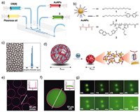 | Fig. 2. (a) Diagram of a four-channel T-shaped microfluidic chip. (b) Schematic representation of AuNPs, and chemical structures of compounds 1, 2 and 3. (c) Transmission electron microscope (TEM) image and dynamic light scattering (DLS) curve of the resultant droplets. (d) Diagram of microdroplets dehydrated to form microcapsules. CLSM images (e) at the interface of and (f) the inside the fluorescent droplets. (g) Time-dependent CLSM images of droplets in the presence of Na2S2O4 solution. Reproduced with permission [10]. Copyright 2012, American Association for the Advancement of Science (AAAS). | |
