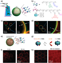 | Fig. 3. (a) Schematic illustration of microfluidic chip and the principles of interfacial assembly. (b) Chemical structures and cartoon representation of compound CB[8], 4 and 5. (c) CLSM image of W/O emulsion. (d) CLSM image of O/W emulsion. (e) Schematic illustration of the encapsulation of CR within capsules via interfacial assembly. (f) CLSM images before and after dehydration of liquid droplets. (g) Schematic illustration of the interfacial assembly system with the introduction of azobenzene. (h) CLSM image before and after 365 nm ultraviolet light irradiation. Reproduced with permission [53]. Copyright 2014, Springer Nature. | |