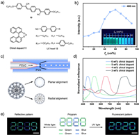 In 2021, Yu and coworkers developed a method for continuously producing monodisperse microdroplets with radially aligned helical structures using capillary microfluidics [59]. These microdroplets comprised fluorescent molecule 10, chiral dopants derived from (S)-binaphthyls 11, and the host molecule 12, possessing liquid crystal (LC) properties (Fig. 5a). To improve the solubility of 10 in liquid crystal 12, flexible n-pentyloxy groups (-OC5H11) was introduced into the structure, resulting in high photoluminescence efficiency. Following modification, compound 10 exhibited clear aggregation-induced emission properties in a mixed solvent of tetrahydrofuran and water, with fluorescence quantum yields of 85.7% in tetrahydrofuran (THF) solution and 100% in solid state, rendering it an excellent luminescent material (Fig. 5b).