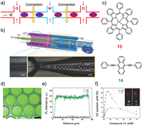 In 2017, Reichmanis and coworkers developed a microfluidic chip featuring a flow-focusing design for preparing three-layer droplets in one step [63]. The microfluidic chip comprises two coaxial glass capillaries that are responsible for forming and collecting droplets. It orchestrates four different flow phases: a hydrocarbon oil-based microliquid core, two internal layers containing water with glycerol, and an outer layer containing PVA (Fig. 6b). This configuration enables the generation of triple emulsions (O/W/O/W) droplets by guiding the four components through the microfluidic chip. These resulting droplets are multilayered and well-suited for encapsulating materials with varying solubilities. Leveraging the stability of these multilayered droplets, the researchers proceeded to encapsulate upconversion luminescent materials (13 and 14), as shown as (Fig. 6c). Notably, within multilayered droplets, the layers act as a barrier against oxygen, thereby enhancing the stability and longevity of the upconversion process. Additionally, the ordered structure within these droplets improves the diffusion efficiency of triple excitons (Figs. 6d–f).