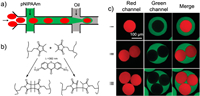 | Fig. 9. (a) Schematic diagram of a microfluidic chip for the preparation of multicompartmental droplets. The internal polymer core is injected into the microfluidic chip following the formation of polymer microspheres, and the concentration can be adjusted in order to obtain a desired number of multi-core droplets. (b) The dimerization of dimethylmaleimide (DMMI) groups on the side chain of pNIPAAm. (c) CLSM images of multicompartmental droplets containing different numbers of polymer cores. Reproduced with permission [74]. Copyright 2010, American Chemical Society. | |