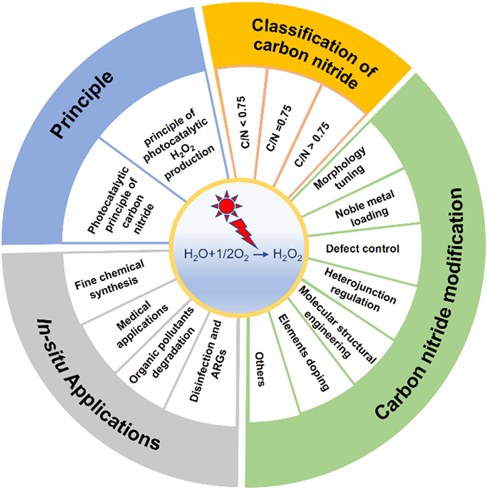 Although there are many reviews on photocatalysis by carbon nitride, they always focused on H2 production and CO2 reduction. There is still a lack of a separate and detailed review on photocatalytic H2O2 production, especially with in-situ applications. Based on this, we herein summarize the relevant research on photocatalytic synthesis of H2O2 by carbon nitride. As shown in Fig. 1, it begins with the fundamental mechanisms of photocatalysis. Secondly, different modification methods for carbon nitride-based materials, including morphology tuning, noble metal loading, defect control, heterojunction regulation, molecular structure engineering, and elements doping, are summarized. Finally, various in-situ applications of H2O2 photosynthesis are discussed, including disinfection and antibiotic resistant genes (ARGs) degradation, organic pollutants degradation, medical applications and fine chemical synthesis.