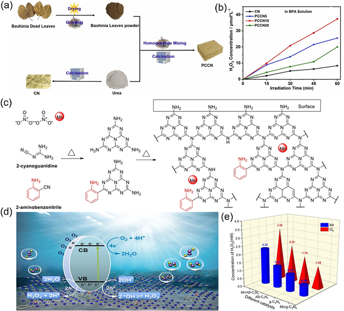 | Fig. 11. (a) The synthesis process of PCCN sample. (b) Time profiles of photocatalytic H2O2 production with different catalysts. Copied with permission [82]. Copyright 2022, Elsevier. (c) The synthesis process of Mn/AB-C3N4. (d) Possible reaction mechanisms of H2O2 production. (e) Photocatalytic H2O2 production using different modified g-C3N4 catalysts. Copied with permission [30]. Copyright 2023, American Chemical Society. | |