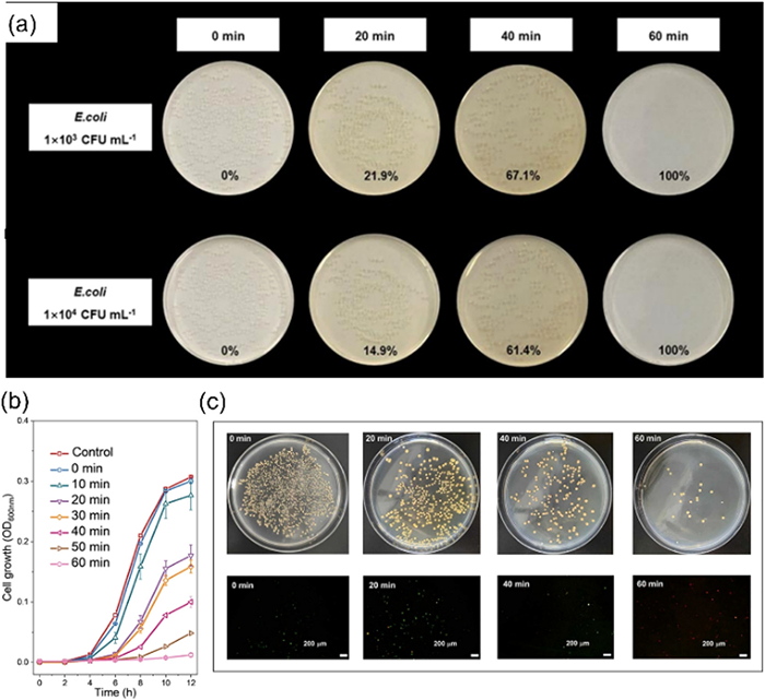 | Fig. 12. (a) The disinfection rate of E. coli. Copied with permission [71]. Copyright 2023, Springer Nature. (b) MRSA growth curves. (c) Plate incubated with LB medium and live/dead staining (merge). Copied with permission [34]. Copyright 2024, Elsevier. | |