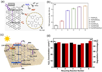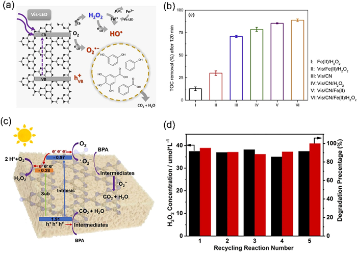 For example, Torres-Pinto et al. constructed an in-situ self-Fenton system using prepared g-C3N4 (Fig. 13a). This system showed the high mineralization rate with pure photocatalytic system, which was five times higher than that of conventional Fenton system. After the addition of Fe2+, the mineralization rate of in-situ self-Fenton system increased by 20% (Fig. 13b) [89]. This result demonstrated the potential of carbon nitride used for in-situ self-Fenton systems for the degradation of organic pollutants. Li et al. also attempted to degrade BPA via an in-situ self-Fenton system (Fig. 13c). These results showed a good degradation efficiency for five cycles, demonstrating the excellent stability of prepared g-C3N4 (Fig. 13d) [82].