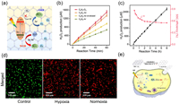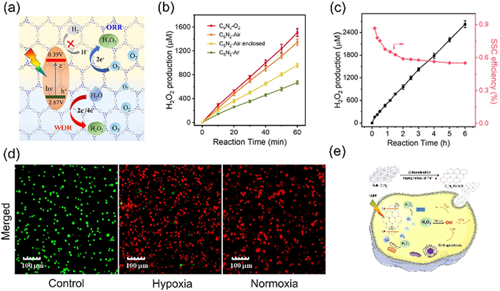 For example, the degradation of H2O2 can alleviate O2 deprivation in the hypoxic tumor microenvironment, thus improving the effectiveness of photodynamic therapy (PDT) [94]. Based on this, Ma et al. reported C5N2 photocatalyst for the selective and non-sacrificial generation of H2O2 in both normoxic and anoxic systems [45]. Due to the reinforcement of delocalization of π-electrons by linkers in C5N2, the side H2 evolution was thermodynamically eliminated, while WOR was kinetically promoted (Fig. 14a). The results showed that C5N2 had excellent performance of photocatalytic H2O2 production (Figs. 14b and c), and also led to fairly significant cell death in both normoxic and hypoxic cellular environments (Fig. 14d). Based on this, they then developed a C5N2-based •OH generator and fluorescent agent for photodynamic hypoxic tumor therapy (Fig. 14e).