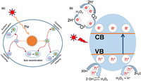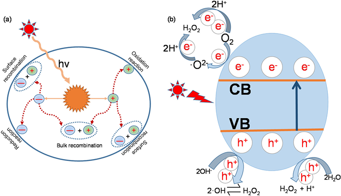 | Fig. 2. (a) Photoexcitation and charge decay pathways in photocatalysts. (b) Schematic diagram of photocatalytic system for producing H2O2. | |