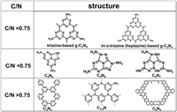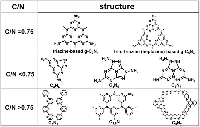 Since C3N4-based carbon nitride was reported by Wang in 2009 [15], many researchers have devoted their attention to this kind of material. In addition to C3N4 with a carbon to nitrogen (C/N) ratio of 0.75, other carbon nitrides with different C/N ratios have been synthesized, including a class of carbon nitride with C/N < 0.75 (C3N5, C3N6, C3N7, etc.), and that with C/N > 0.75 (C3N3, C3.6N, C5N2, etc.) (Fig. 3).