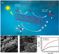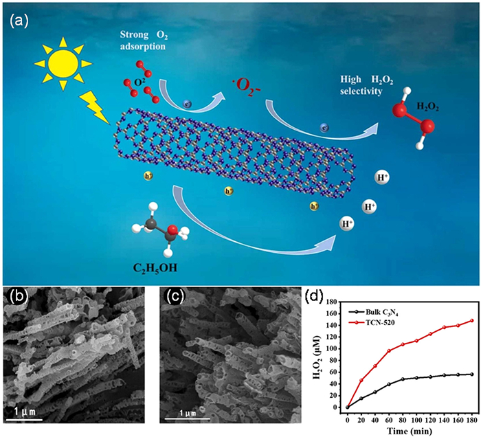 Xu et al. synthesized uniformly porous carbon nitride nanotubes using a supramolecular self-assembly method [47]. They obtained uniform carbon nitride nanotubes (TCN-520) with 1–3 µm in length and a diameter of 10–20 nm via a calcination temperature of 520℃. TCN-520 can generate H2O2 by the two-step 1e- process (Fig. 5a). Additionally, the nanotube displayed a porous structure due to the gas released during the calcination process (Figs. 5b and c). TCN-520 exhibited a higher photocatalytic H2O2 yield than pristine bulk carbon nitride (Fig. 5d). The reasons could be attributed to that the nanotube structure had a large specific surface area, outstanding electron transport rate, O2 adsorbing capability and high selectivity of 2e- ORR.